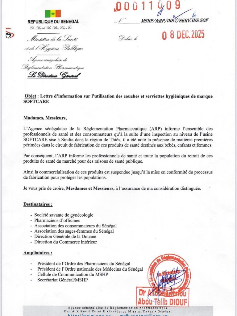 L’Agence sénégalaise de la Réglementation Pharmaceutique (ARP) a pris une mesure forte ce 8 décembre 2025 en ordonnant le retrait immédiat des couches et serviettes hygiéniques de la marque Softcare du marché national. Cette décision fait suite à une inspection menée dans l’usine de production située à Sindia, dans la région de Thiès, où des irrégularités graves ont été relevées, notamment l’utilisation de matières premières périmées dans la chaîne de fabrication.