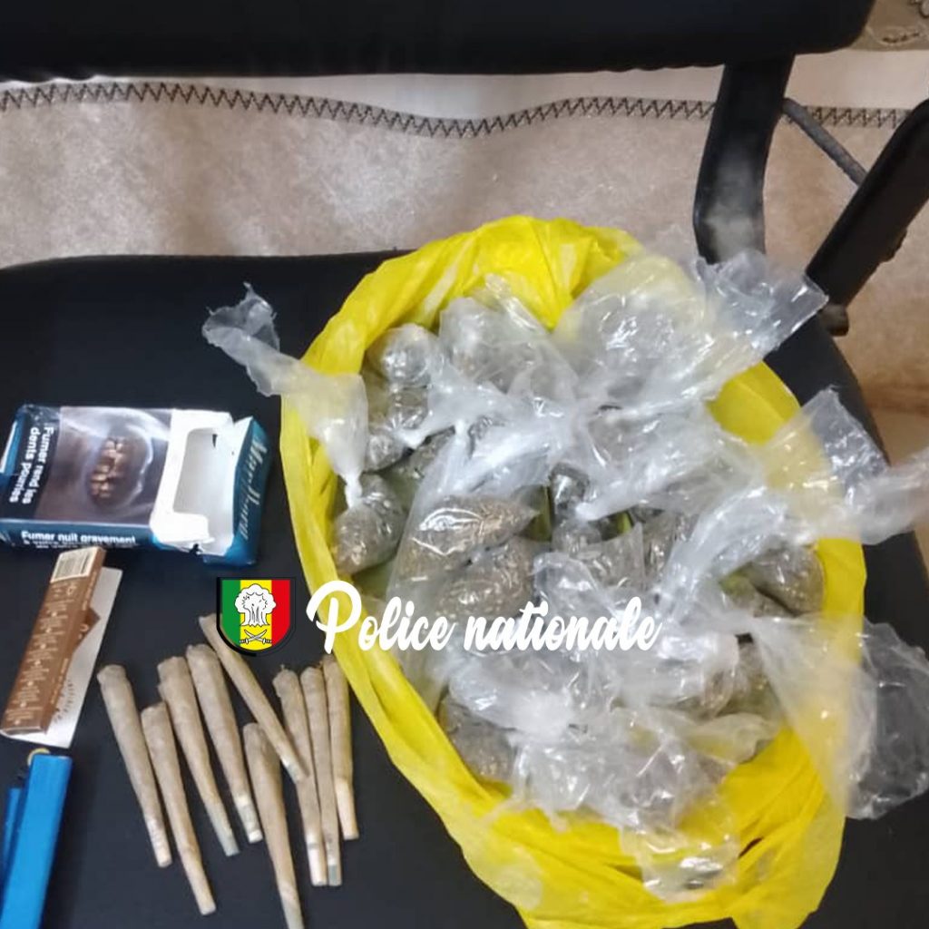 La perquisition des lieux s’est livrée fructueuse avec la découverte de 25 sachets en plastique contenant du chanvre indien, cachés dans les toilettes. Une somme de trois milles francs (3000fcfa) a également été saisie et représentant : le produit de vente.